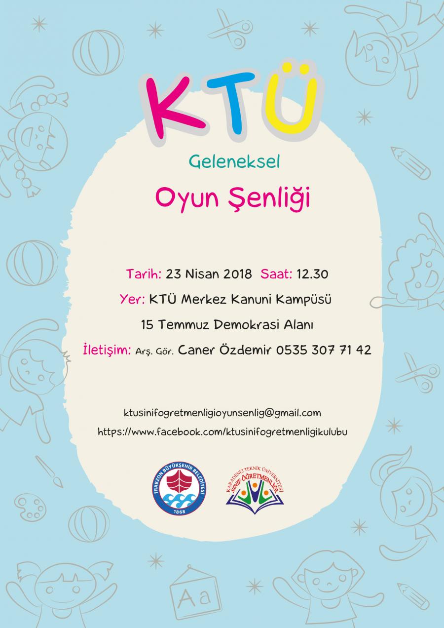 Karadeniz Teknik Üniversitesi Rektörlüğü, Sınıf Öğretmenliği Kulübü tarafından Doç.Dr. Tolga ERDOĞAN Koordinatörlüğünde 23 Nisan 2018 Pazartesi günü saat 12.30'da Anaokulu ve İlkokul öğrencilerine yönelik Oyun Şenliği düzenlenecektir. Tüm personelimiz çocukları ile birlikte davetlidir.