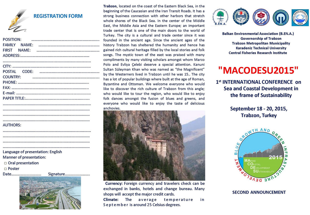 Balkan Çevre Birliği (Balkan Environmental Association/BENA) ve Karadeniz Teknik Üniversitesi (Deniz Bilimleri ve Orman Fakülteleri'nin katılımıyla) ile Trabzon Su Ürünleri Merkez Araştırma Enstitüsü Müdürlüğü'nün işbirliğinde ortaklaşa 18-20 Eylül 2015 tarihleri arasında düzenlenen "1st International Conference on Sea and Coastal Development in the Frame of Sustainability" (Macodesu2015)"/ Sürdürülebilirlik Kapsamında Deniz ve Kıyı Gelişimi 1.Uluslararası Konferansı, KTÜ Kanuni Kampüsünde Osman Turan Kongre ve Kültür Merkezi'nde yapılacaktır.