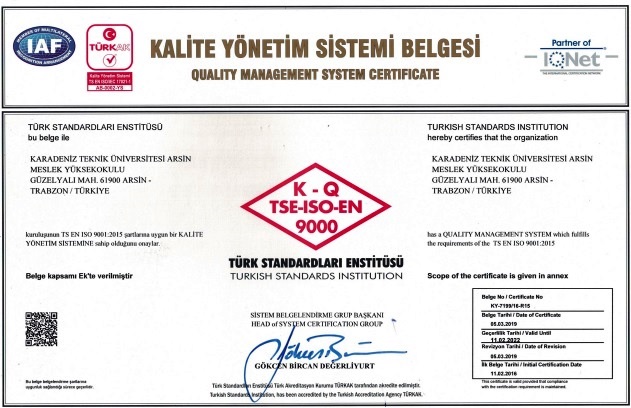 Arsin Meslek Yüksekokulu ISO 9001:2015 Kalite Yönetim Sistemi Belgesi Aldı