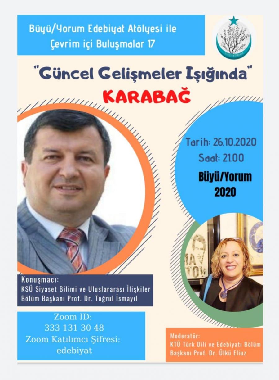 26 Ekim 2020 Pazartesi günü (bugün) Saat 21.00’de KTÜ Büyü/Yorum Edebiyat atölyesi çevrim içi buluşmalarının 17’ncisi KSÜ Siyaset Bilimi ve Uluslararası İlişkiler Bölüm Başkanı Prof. Dr. Toğrul İSMAYIL ile Üniversitemiz Edebiyat Fakültesi Türk Dili ve Edebiyatı Bölüm Başkanı Prof. Dr. Ülkü ELİUZ’un “Güncel Gelişmeler Işığında Karabağ” adlı söyleşisi uzaktan bağlantı ile gerçekleştirilecektir.