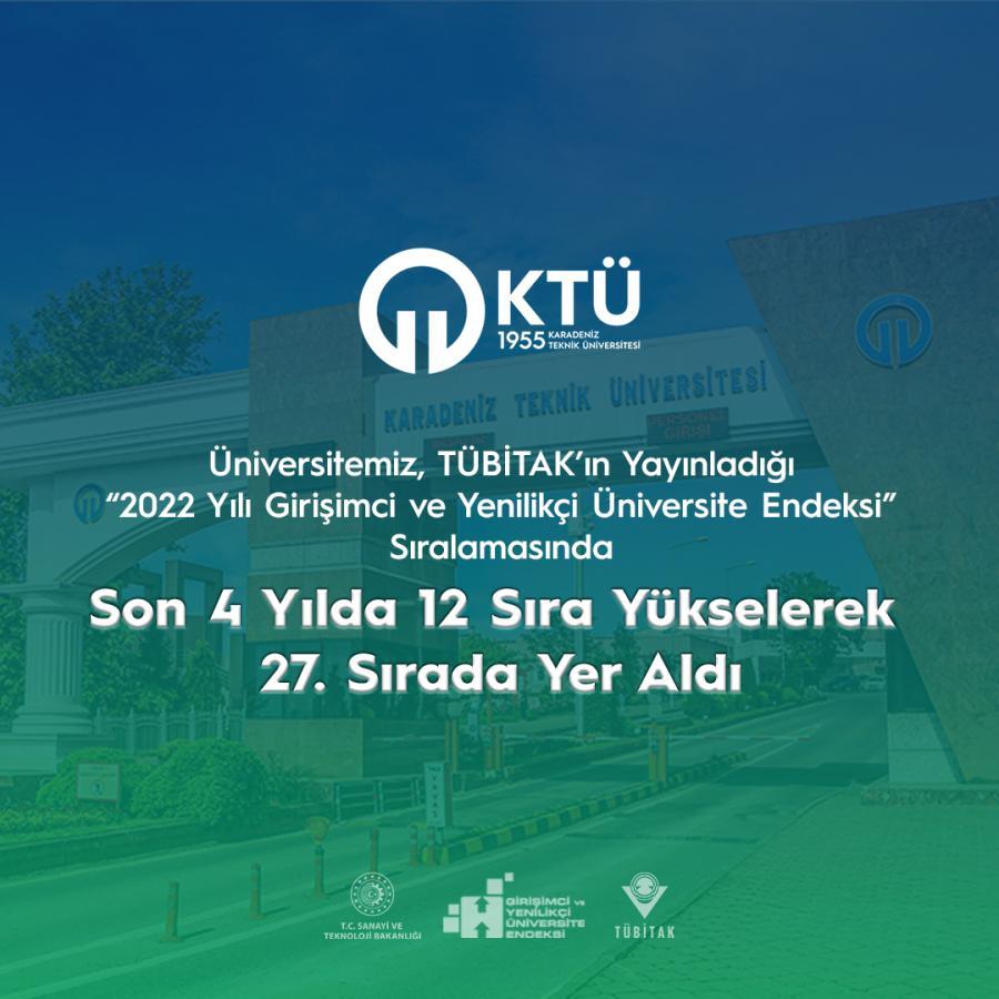 Girişimci ve Yenilikçi Üniversite Endeksi’nde üniversiteler, 4 boyut altında 23 göstergeye göre sıralanmaktadır. Endeks sıralamasına, öğretim üyesi sayısı 50'nin üzerinde olan 192 üniversite dâhil edilmiş olup endeksin veri toplama sürecine 287 kurum katkı sağlamıştır. Buna göre, her boyutta alınan toplam puana göre Üniversitemiz; “Bilimsel ve Teknolojik Araştırma Yetkinliği” boyutunda 7,67 “Fikrî Mülkiyet Havuzu” boyutunda 8,6 “İş Birliği ve Etkileşim” boyutunda 13,93 ve “Ekonomik ve Toplumsal Katkı” boyutunda 18,86 puan almıştır. Üniversitemiz 2020 yılında 33’üncü, 2021 yılında ise 31’inci sırada yer alırken 2022 yılında 27’nci sırada yer alarak yükselişe geçmiştir.