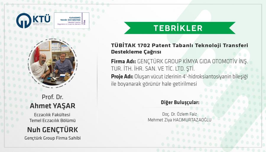 2014 yılında Karadeniz Teknik Üniversitesi'nden Prof. Dr. Ahmet YAŞAR'ın ve Recep Tayyip Erdoğan Üniversitesi'nden Doç. Dr. Özlem FAİZ'in ve Mehmet Ziya HACIMURTAZAOĞLU'nun buluşçu olarak yer aldığı ulusal ve uluslararası patent başvurusu yapılan " Oluşan vücut izlerinin 4' hidroksiantosiyanin bileşiği ile boyanarak görünür hale getirilmesi" başlıklı İtalya Tescilli buluş için Gençtürk Group firmasının müşteri kuruluş olarak yer aldığı ve firma sahibi Nuh GENÇTÜRK' ün proje yürütücüsü olduğu proje 24 ay sürecektir. TÜBİTAK 1702 Patent Tabanlı Teknoloji Transferi Destekleme Programının amacı Yenilik Destek Programı ile gerçek ve tüzel kişilerin araştırma, teknoloji geliştirme ve yenilik faaliyetleri ve üniversite-sanayi iş birliği, teknoloji transferi, kümeleşme, girişimcilik ve ticarileştirme faaliyetlerine destek sağlanması amaçlanmaktadır. Üniversitemizin adına kayıtlı patentin ticarileşen ilk örneği niteliği taşımaktadır. KTÜ Akademisyenlerinden Prof. Dr. Ahmet YAŞAR' , RTEU Akademisyenlerinden Doç.Dr. Özlem FAİZ'i ve Mehmet Ziya HACIMURTAZAOĞLU' nu tebrik eder başarılarının devamını dileriz.