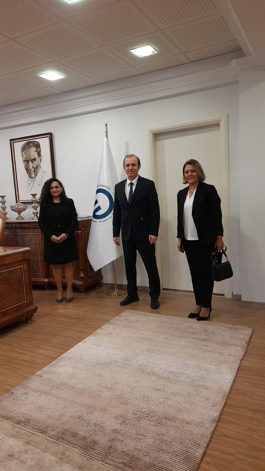 Üniversitemiz Kadın Çalışmaları Uygulama ve Araştırma Merkezi (KTÜKAM) Müdürü Dr. Öğr. Üyesi Ayça EMİNOĞLU ve İpekyolu Kadın, Girişim, Üretim ve İşletme Kooperatifi Başkanı Bahar KASTAN, Rektörümüz Prof. Dr. Hamdullah ÇUVALCI’yı makamında ziyaret etti.