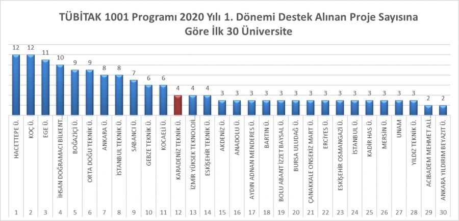 Karadeniz Teknik Üniversitesi, desteklenmeye hak kazanan 4 adet projeyle, İzmir İleri teknoloji Enstitüsü ve Eskişehir Teknik Üniversitesi ile birlikte "Proje Kabul Sayısına" göre devlet üniversiteleri içerisinde 9'uncu, tüm üniversiteler içerisinde ise 12. sırada yer aldı.