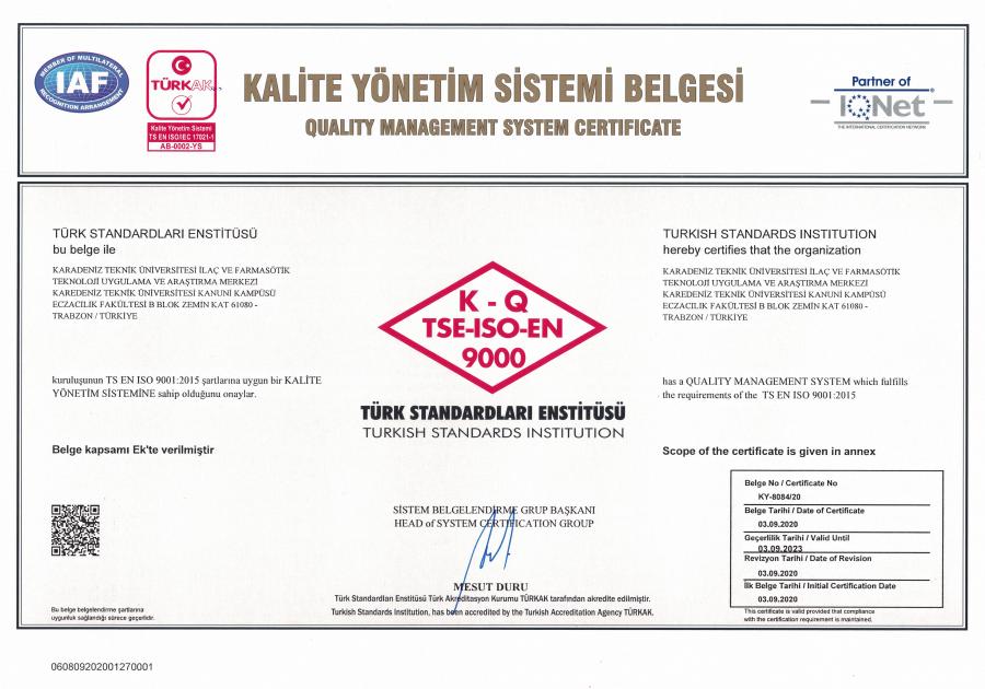 Üniversitemiz İlaç ve Farmasötik Teknoloji Uygulama ve Araştırma Merkezi (İLAFAR); Türk Standartları Enstitüsü tarafından yapılan denetimler sonucu TS EN ISO 9001:2015 Kalite Yönetim Sistemi Belgesi'ni almaya hak kazandı.