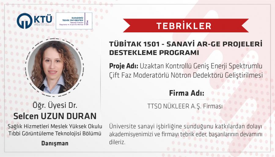 TTSO NÜKLEER A.Ş. firmasının yürütücü olduğu ve Üniversitemiz araştırmacılarından Öğr. Üyesi Dr. Selcen UZUN DURAN'ın danışman olarak yer aldığı TÜBİTAK 1501 Sanayi Ar-Ge Projeleri Destekleme Programı Çağrısı için sunulan "Uzaktan Kontrollü Geniş Enerji Spektrumlu Çift Faz Moderatörlü Nötron Dedektörü Geliştirilmesi" başlıklı projesi destek almaya hak kazanmıştır.