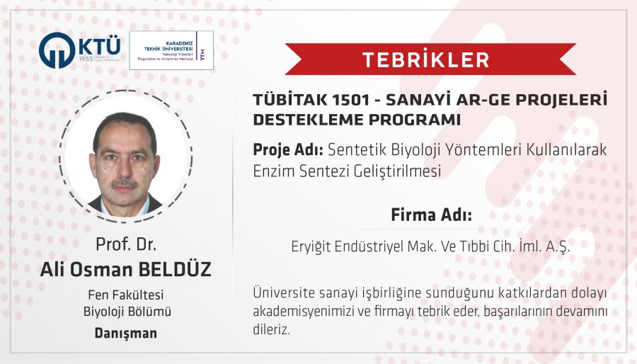 Eryiğit Endüstriyel Mak. Ve Tıbbi Cih. İml. A.Ş. firmasının yürütücü olduğu ve Üniversitemiz araştırmacılarından Prof. Dr. Ali Osman BELDÜZ'ün danışman olarak yer aldığı TÜBİTAK 1501 Sanayi Ar-Ge Projeleri Destekleme Programı Çağrısına sunulan " Sentetik Biyoloji Yöntemleri Kullanılarak Enzim Sentezi Geliştirilmesi" projesi destek almaya hak kazanmıştır.