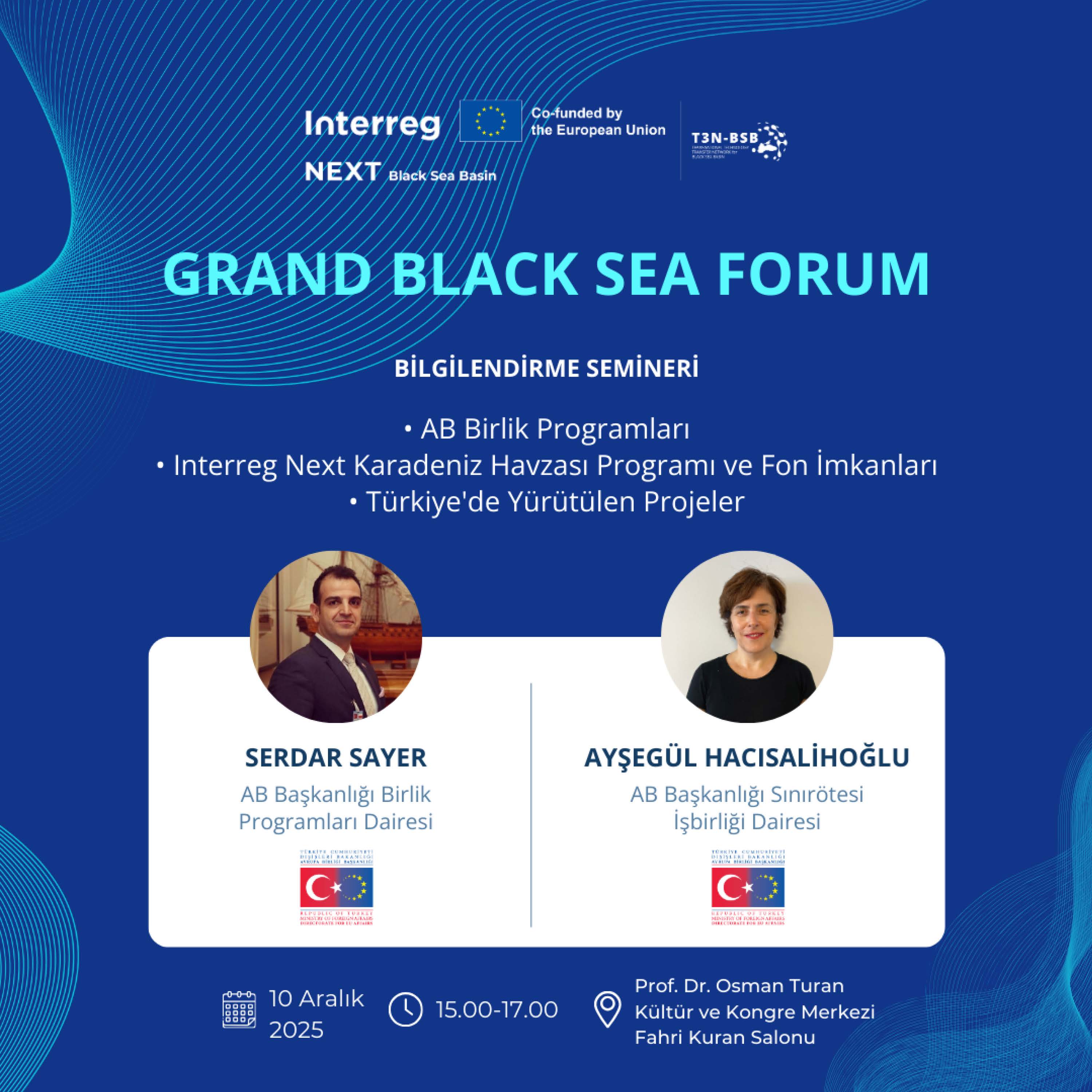 "AB Birlik Programları”, “Interreg Next Karadeniz Havzası Programı ve Fon İmkanları”, “Türkiye'de Yürütülen Projeler" Bilgilendirme Semineri: T.C. Dışişleri Bakanlığı Avrupa Birliği Başkanlığı Uzmanları Serdar SAYER ve Ayşegül HACISALİHOĞLU bilgi ve deneyimlerini katılımcılara aktaracaktır.
