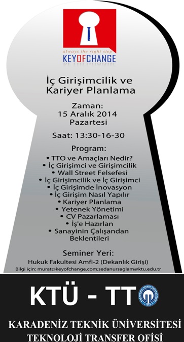 Hedef kitlesi üniversitemizin öğrencileri olan İç Girişimcilik ve Kariyer Planlama Semineri KTÜ-TTO Organizasyonuyla, 19.12.2014 tarihinde (13.30-16.30) Fen-Edebiyat Fakültesi, Nazım Terzioğlu Amfi'sinde gerçekleştirilecektir.