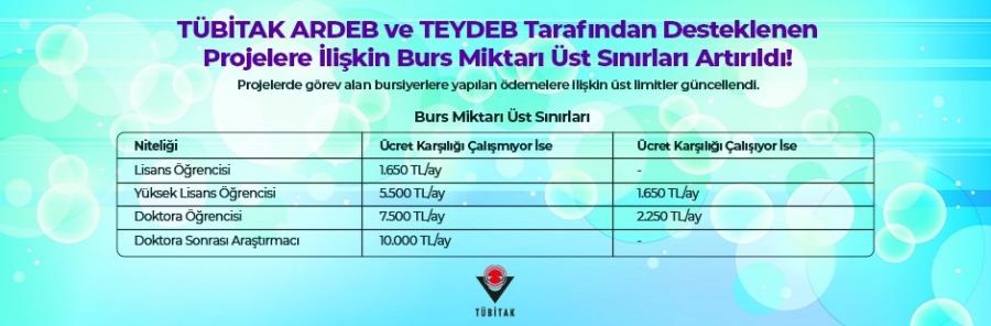 TÜBİTAK Araştırma Destek Programları Başkanlığı (ARDEB) ve Teknoloji ve Yenilik Destek Programları Başkanlığı (TEYDEB) tarafından yürütülen programlar kapsamında desteklenen projelerde görev alan lisans, yüksek lisans, doktora ve doktora sonrası araştırmacılara proje bütçesinden ödenebilecek burs üst limitleri güncellendi. Güncel burs miktarları görselde yer almaktadır.