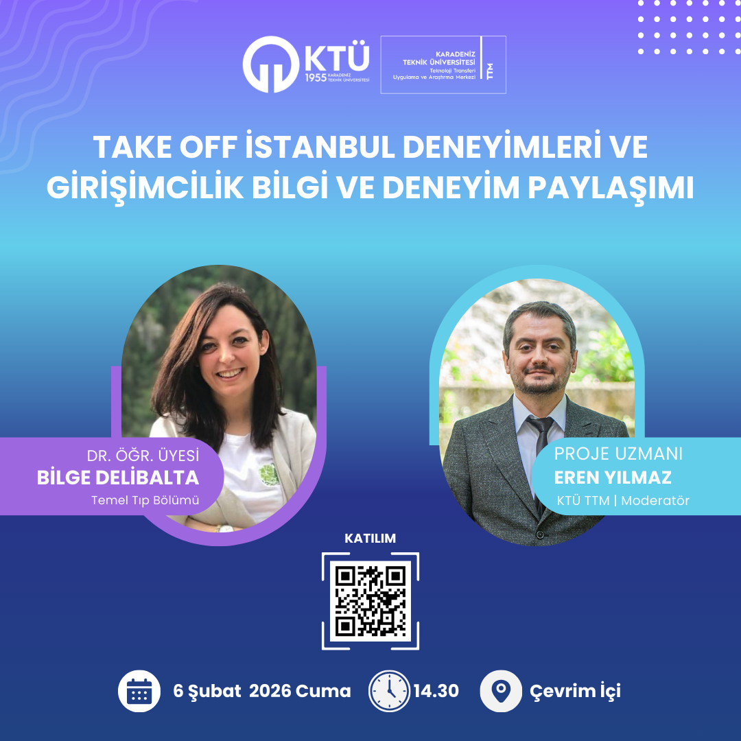 Etkinlikte katılımcılar; ulusal ve uluslararası girişimcilik ekosisteminde önemli bir buluşma noktası olan Take Off İstanbul deneyimleri üzerinden, girişimcilik yolculuğu, akademiden girişime geçiş ve teknoloji tabanlı iş fikirlerinin ticarileştirilmesine ilişkin Dr. Öğr. Üyesi Bilge DELİBALTA'nın bilgi ve deneyimlerinden faydalanma imkânı bulacaktır.