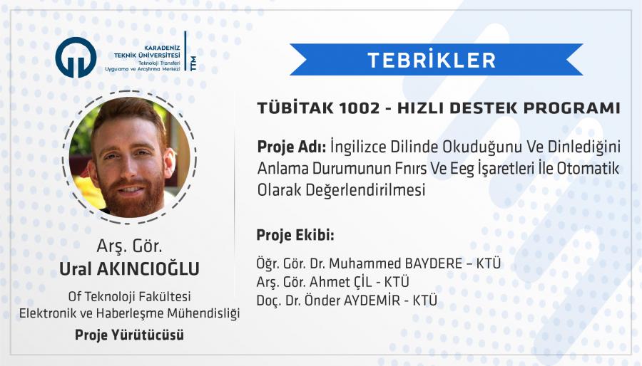 Üniversitemiz Of Teknoloji Fakültesi Elektronik ve Haberleşme Mühendisliği Bölümü öğretim elemanlarından Arş. Gör. Ural AKINCIOĞLU’nun , “İngilizce Dilinde Okuduğunu Ve Dinlediğini Anlama Durumunun Fnırs Ve Eeg İşaretleri İle Otomatik Olarak Değerlendirilmesi” başlıklı projesi, TÜBİTAK 1002 Programı kapsamında desteklendi.