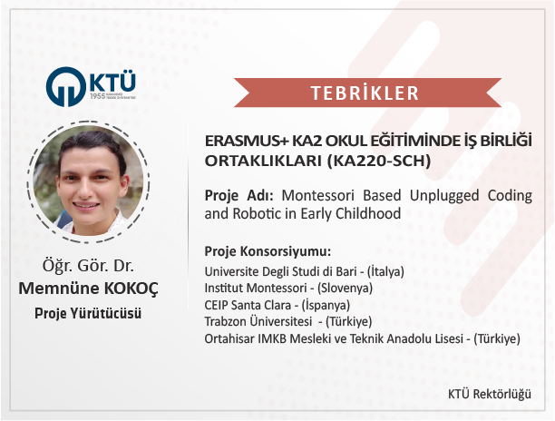 İtalya’dan “Universite Degli Studi di Bari”, Slovenya’dan “Institut Montessori”, İspanya’dan “CEIP SANTA CLARA” ve ülkemizden “Trabzon Üniversitesi” ile “Ortahisar IMKB Mesleki ve Teknik Anadolu Lisesi” kurumlarının ortaklığıyla sunulan projenin toplam bütçesi 120.000 Euro, amacı ise projede erken çocukluk dönemi eğitiminde, Montessori yaklaşımı çerçevesinde geliştirilecek yenilikçi bilgisayarsız (unplugged) kodlama ve robotik etkinliklerle okul öncesi öğrencilere disiplinler arası algoritmik düşünme ve problem çözme becerilerinin kazandırılması ve öğretmen yeterliklerinin arttırılmasıdır.