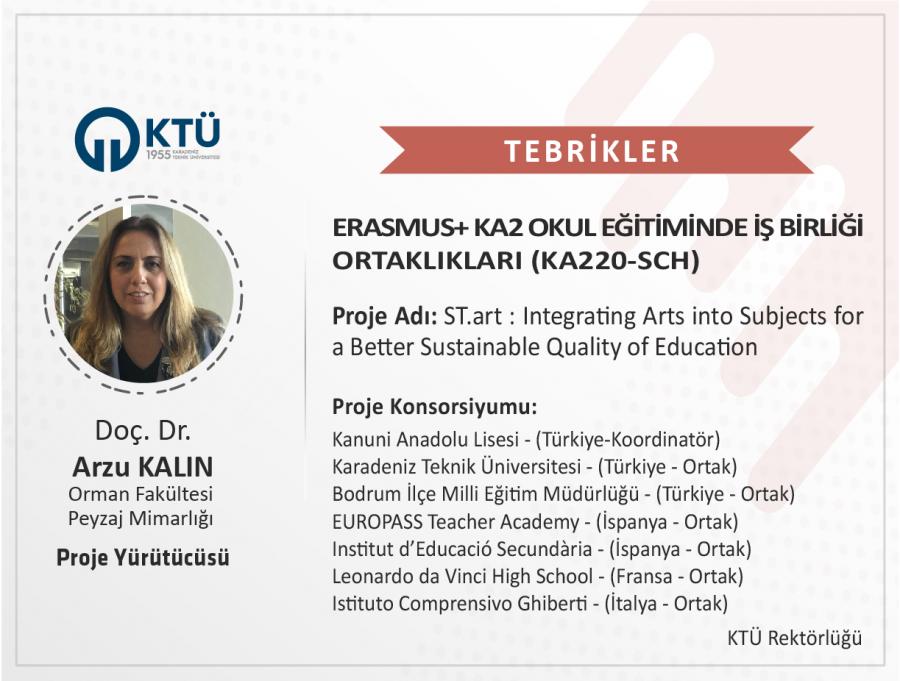 Üniversitemizin ortak olarak yer aldığı ve 2022 yılında Erasmus+ Programı KA2 Okul eğitiminde İş Birliği Ortaklıkları (KA220-SCH) kapsamında açılan teklif çağrısına “ST.art : Integrating Arts into Subjects for a Better Sustainable Quality of Education” ismiyle sunulan proje başvurusu desteklenmeye hak kazanmıştır (Proje Kodu: 2022-1-TR01-KA220-SCH-000086635).