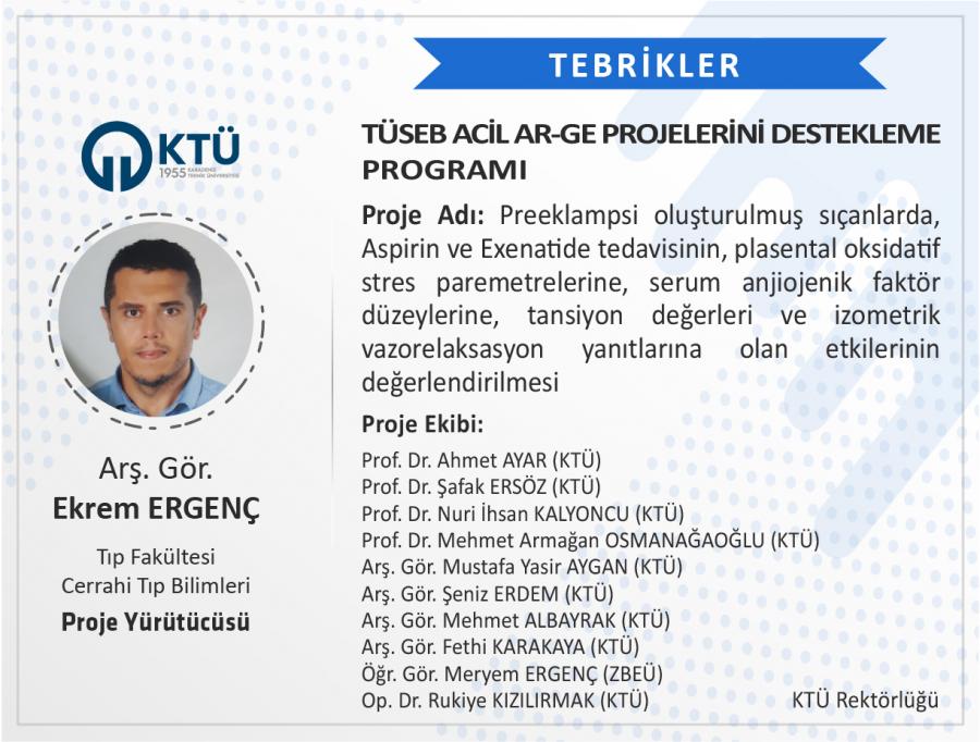 Üniversitemiz Tıp Fakültesi Cerrahi Tıp Bilimleri Bölümü Öğretim Üyesi Arş. Gör. Ekrem ERGENÇ’in "Preeklampsi Oluşturulmuş Sıçanlarda Aspirin ve Exenatide Tedavisinin Plasental Oksidatif Stres Paremetrelerine, Serum Anjiojenik Faktör Düzeylerine, Tansiyon Değerleri ve İzometrik Vazorelaksasyon Yanıtlarına Olan Etkilerinin Değerlendirilmesi" başlıklı projesi TÜSEB Acil Ar-Ge Projelerini Destekleme Programı kapsamında desteklenmiştir.