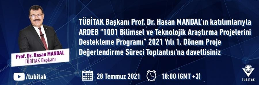 Araştırma Destek Programları Başkanlığı (ARDEB) bünyesinde yürütülmekte olan “1001-Bilimsel ve Teknolojik Araştırma Projelerini Destekleme Programının 2021 Yılı 1. Dönem proje değerlendirme süreci ve sonuçlarını paylaşmak; “gelecek odaklı süreç iyileştirmeye” yönelik olarak, TÜBİTAK Başkanı Prof. Dr. Sayın Hasan MANDAL’ın katılımlarıyla, 28 Temmuz 2021 Çarşamba günü saat 18:00’de çevrim içi toplantı düzenlenecektir.
