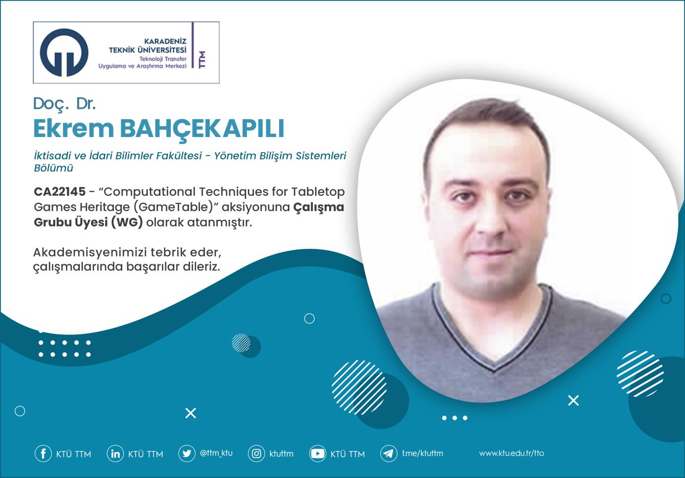 Üniversitemiz İktisadi ve İdari Bilimler Fakültesi Yönetim Bilişim Sistemleri Bölümü öğretim üyesi Doç. Dr. Ekrem BAHÇEKAPILI, COST Programı’nın “CA22145 - Computational Techniques for Tabletop Games Heritage (GameTable)” aksiyonuna Çalışma Grubu Üyesi (WG) olarak atanmıştır.
