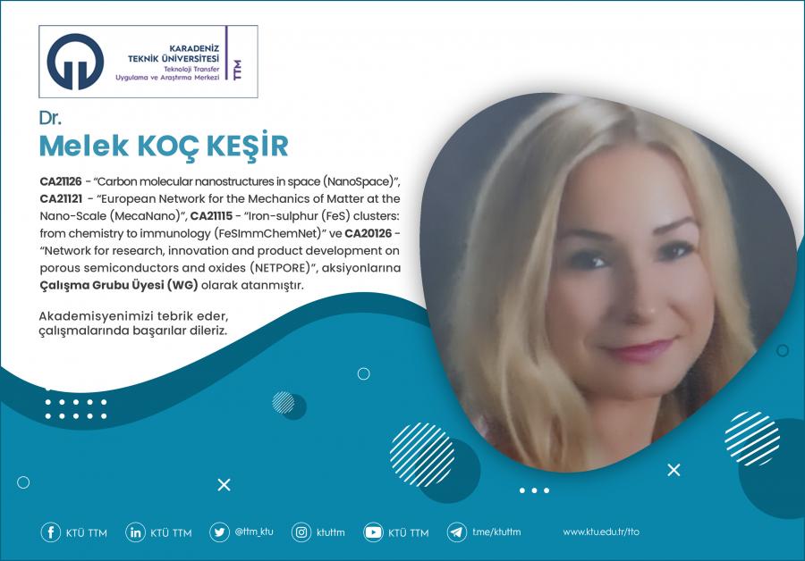 Üniversitemizde doktora sonrası araştırmalarına devam eden Dr. Melek KOÇ KEŞİR, COST Programı’nın “CA21126 - Carbon molecular nanostructures in space (NanoSpace)” ,“CA21121 - European Network for the Mechanics of Matter at the Nano-Scale (MecaNano)”, “CA21115 - Iron-sulphur (FeS) clusters: from chemistry to immunology (FeSImmChemNet)” ve “CA20126 - Network for research, innovation and product development on porous semiconductors and oxides (NETPORE)” aksiyonlarına Çalışma Grubu Üyesi (WG)” olarak atanmıştır.
