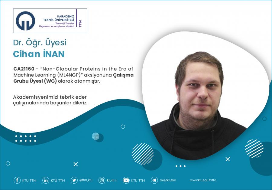 Üniversitemiz Fen Fakültesi Moleküler Biyoloji ve Genetik Bölümü öğretim üyesi Dr. Öğr. Üyesi Cihan İNAN, COST Programı’nın “CA21160 - Non-Globular Proteins in the Era of Machine Learning (ML4NGP)” aksiyonuna Çalışma Grubu Üyesi (WG) olarak atanmıştır.