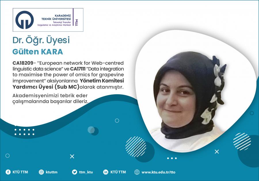 Üniversitemiz Mühendislik Fakültesi Harita Mühendisliği öğretim üyesi Dr.Öğr.Üyesi Gülten KARA, COST Programı’nın “CA18209 - European network for Web-centred linguistic data science” ve “CA17111 - Data integration to maximise the power of omics for grapevine improvement” aksiyonlarına Yönetim Komitesi Yardımcı Üyesi (Sub MC) olarak atanmıştır.