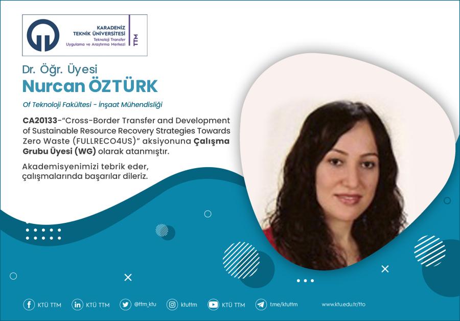 Üniversitemiz Of Teknoloji Fakültesi İnşaat Mühendisliği Bölümü öğretim üyesi Dr.Öğr.Üyesi Nurcan ÖZTÜRK, COST Programı’nın “CA20133 - Cross-Border Transfer and Development of Sustainable Resource Recovery Strategies Towards Zero Waste (FULLRECO4US)” aksiyonuna Çalışma Grubu Üyesi (WG) olarak atanmıştır.