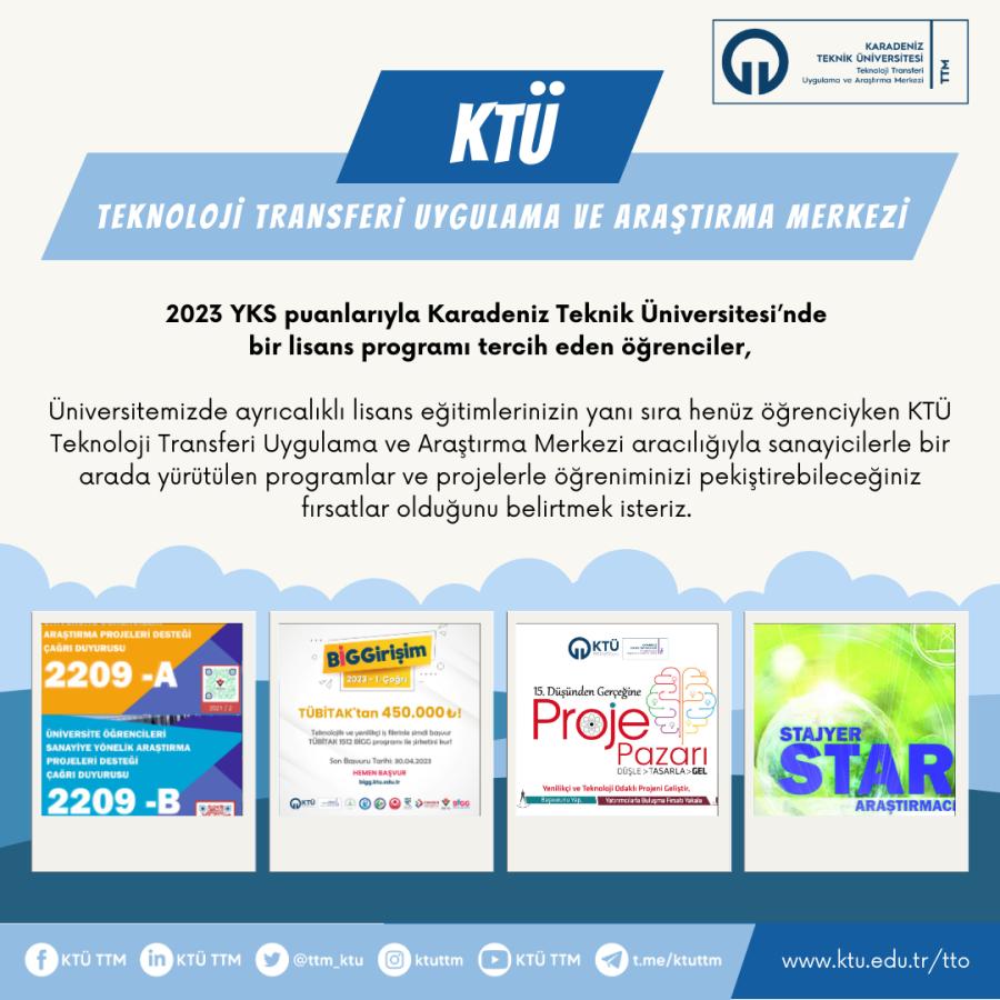 Üniversitemizde ayrıcalıklı lisans eğitimlerinizin yanı sıra henüz öğrenciyken KTÜ Teknoloji Transferi Uygulama ve Araştırma Merkezi aracılığıyla sanayicilerle bir arada yürütülen programlar ve projelerle öğreniminizi pekiştirebileceğiniz fırsatlar olduğunu belirtmek isteriz.