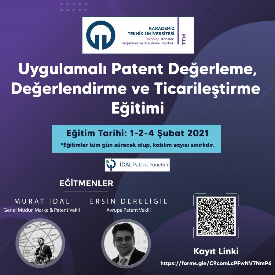 KTÜ TTM tarafından 1, 2 ve 4 Şubat 2021 Tarihlerinde 3 günlük "Uygulamalı Patent Değerleme, Değerlendirme ve Ticarileştirme Eğitimi" düzenlenecektir.