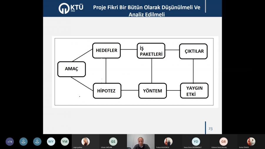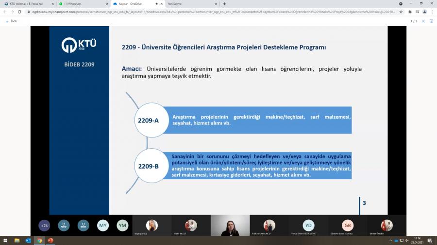 Üniversitemizde lisans öğrencilerinin başvuru yapabilecekleri araştırma burs programları hakkında 22 Nisan Perşembe Günü çevrimiçi bilgilendirme etkinliği düzenlendi. Etkinliğe 11 farklı üniversite ve bu üniversitelerin farklı bölümlerden yaklaşık 240 başvuru alınmıştır. Etkinlikte KTÜ TTM uzmanları tarafından, Temel Bilimsel Kavramlar, TÜBİTAK 2209 Burs Programları ve BİGG Programı ile lisans öğrencilerinin faydalanabileceği diğer TÜBİTAK Programları hakkında bilgilendirme yapılarak başvuru formlarının ve başvuru sisteminin tanıtımı gerçekleştirildi.