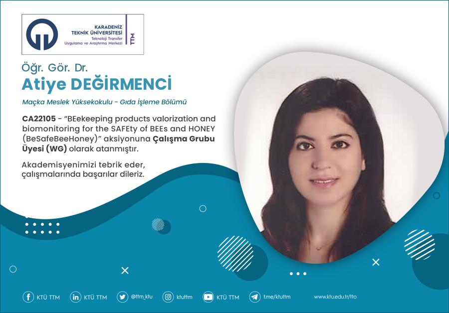 Üniversitemiz Maçka Meslek Yüksekokulu Gıda İşleme Bölümü öğretim elemanı Öğr. Gör. Dr. Atiye DEĞİRMENCİ, COST Programı’nın “CA22105 - BEekeeping products valorization and biomonitoring for the SAFEty of BEEs and HONEY (BeSafeBeeHoney)” aksiyonuna Çalışma Grubu Üyesi (WG) olarak atanmıştır.