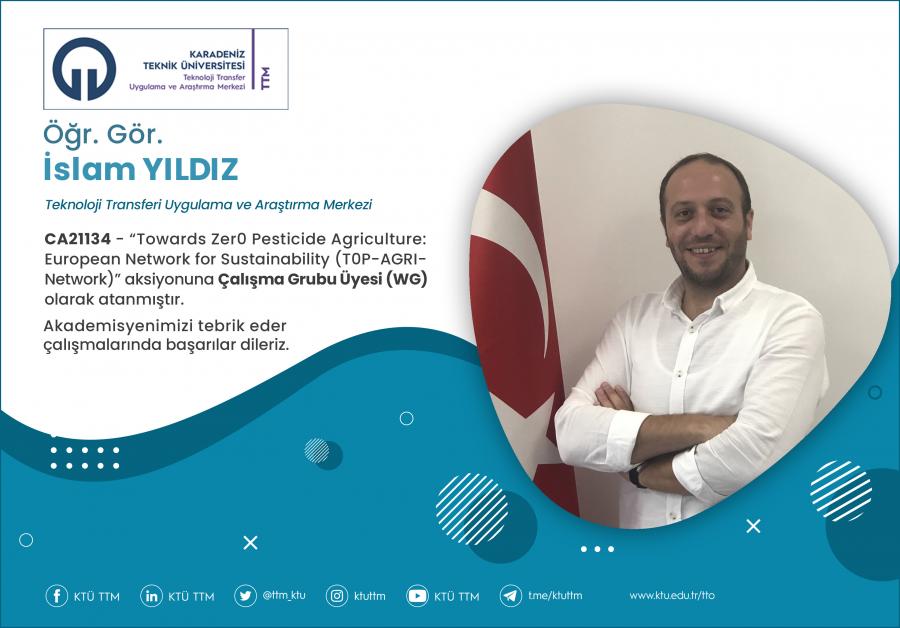 Üniversitemiz Teknoloji Transferi Uygulama ve Araştırma Merkezi Bölümü öğretim elemanı Öğr.Gör. İslam YILDIZ, COST Programı’nın “CA21134 - Towards Zer0 Pesticide Agriculture: European Network for Sustainability (T0P-AGRI-Network)” aksiyonuna Çalışma Grubu Üyesi (WG) olarak atanmıştır.