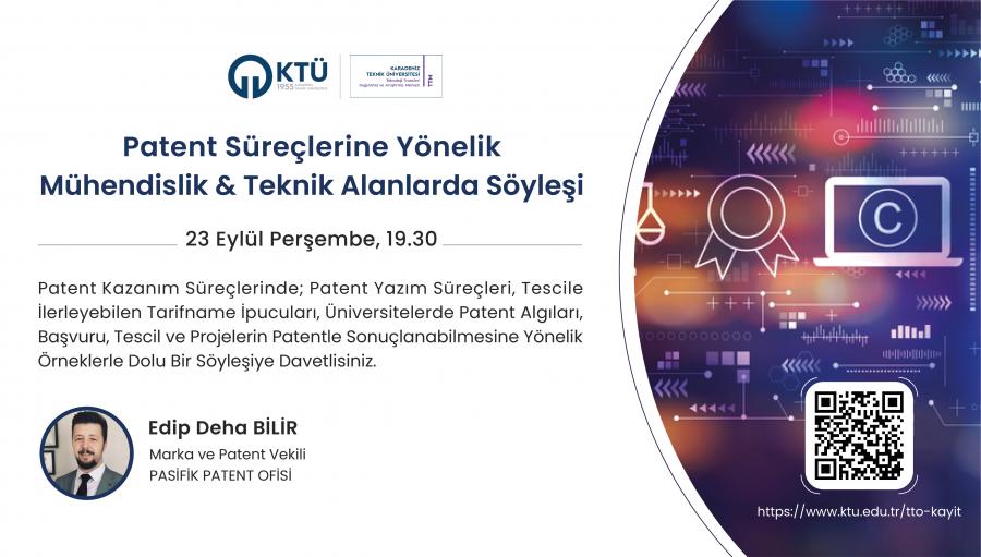 Pasifik Patent Kurucusu ve Patent Vekili Edip Deha BİLİR ve KTÜ TTM iş ortaklığı kapsamında Mühendislik ve Teknik alanların patent ekosistemine sağlayacağı katkının arttırılması, tescil süreçlerine hızlı şekilde ilerleyen patent başvurularının elde edilmesi ve ticarileşme potansiyeli odağında akademik çalışmalarını patente konu edebilen buluş sahiplerinin ekosisteme kazandırılması amacıyla düzenleyeceğimiz Söyleşi'nin tüm fikri ve sınai mülkiyet hakları süreçlerine katkı sağlayacağına inanıyoruz.