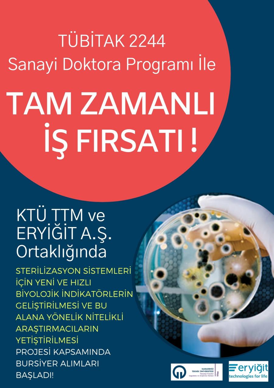 TÜBİTAK tarafından sanayide ihtiyaç duyulan doktora derecesine sahip nitelikli insan kaynağının yetiştirilmesi ve sanayide doktoralı araştırmacı istihdamının teşvik edilmesi amacıyla başlatılan 2244 Kodlu Sanayi Doktora Programı çerçevesinde, Karadeniz Teknik Üniversitesi, ERYİĞİT Endüstriyel Mak. Ve Tıbbi Cih. A.Ş ortaklığında Sanayi Doktora programı için bursiyer başvuruları alınmaya başlandı.