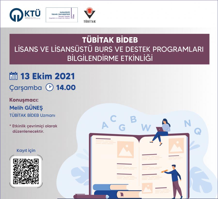 Üniversitemiz lisans ve lisansüstü öğrencilerine yönelik TÜBİTAK BİDEB Burs programları ile ilgili TÜBİTAK BİDEB Uzmanı Melih GÜNEŞ’in konuşmacı olarak katılacağı 13 Ekim 2021 Çarşamba saat 14.00’da çevrimiçi bilgilendirme etklinliği düzenlenecektir.