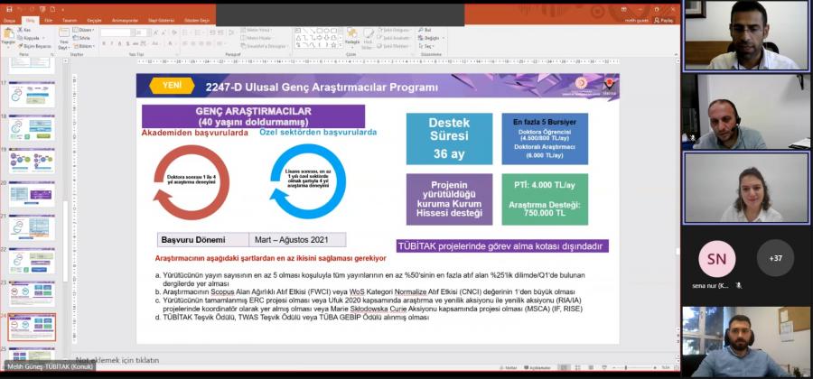 Üniversitemiz lisans ve lisansüstü öğrencileri ile doktora sonrası araştırmacılara yönelik TÜBİTAK Bilim İnsanı Destekleme Daire Başkanlığı (BİDEB) Burs programları hakkında çevrimiçi bilgilendirme etkinliği düzenlendi. Etkinlik, TÜBİTAK BİDEB Uzmanı Melih GÜNEŞ’in burs programları sunumunun ardından soru cevap ile tamamlandı.