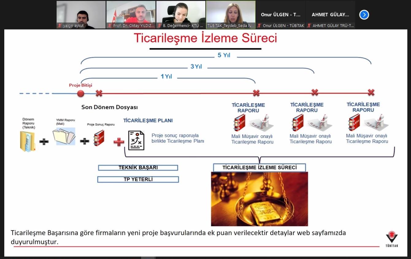TÜBİTAK ile KTÜ TTM işbirliği çerçevesinde "Üniversite Sanayi İş Birliği Programları" hakkında online bir bilgilendirme toplantısı gerçekleştirildi. Toplantıda TÜBİTAK uzmanları Seda Nur Budak ve Onur Ülgen, ilgili programların şartları ve son gelişmeler hakkında katılımcılara detaylı bilgi sundular.
