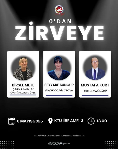 Karadeniz Teknik Üniversitesi İktisadi ve İdari Bilimler Fakültesi Amfi-3’te düzenlenen “0’dan Zirveye” başlıklı etkinlik, öğrencileri ve katılımcıları farklı sektörlerden önemli isimlerle bir araya getirdi.